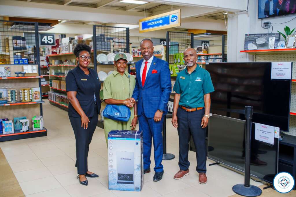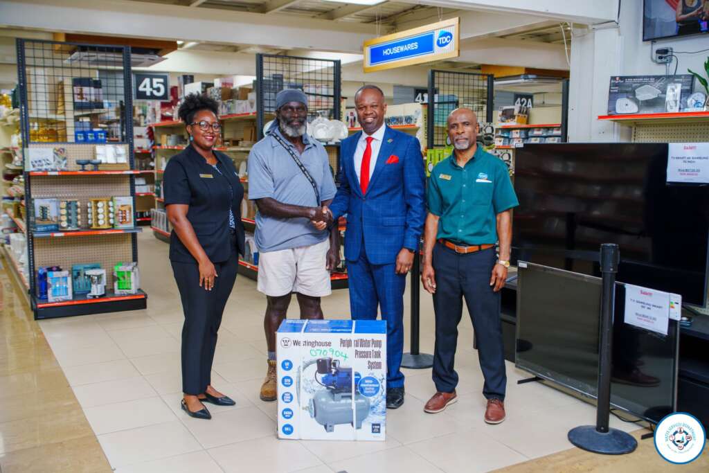 In a brief ceremony held at the TDC Home and Building Depot at the C.A. Paul Southwell Industrial Site, Minister of Public Infrastructure, Energy and Utilities, the Hon. Konris Maynard awarded two lucky customers with their prizes. Mr. Henry Matthew received a pump and Ms. Cheryldene Roberts received a gas tankless water heater, both useful household items.